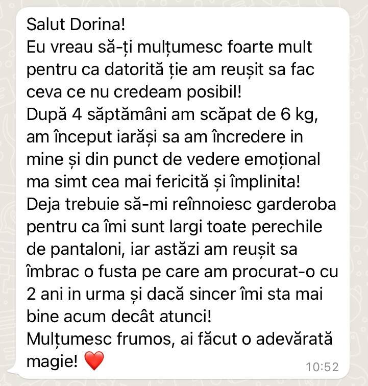 Am o experiență de peste 5 ani și, în această perioadă, am ajutat cel puțin 3500 de persoane să slăbească, să-și crească încrederea în sine și să-și creeze obiceiuri sănătoase. Nu sunt nutriționistul care îți vorbește doar din cărți. Pe lângă studii, personal am avut kilograme în plus, am slăbit 28 kg și știu foarte bine provocările prin care trec persoanele care doresc să slăbească. Am trecut prin anorexie, bulimie, ortorexie – motiv pentru care nu promovez fanatismul, ci o alimentație echilibrată.